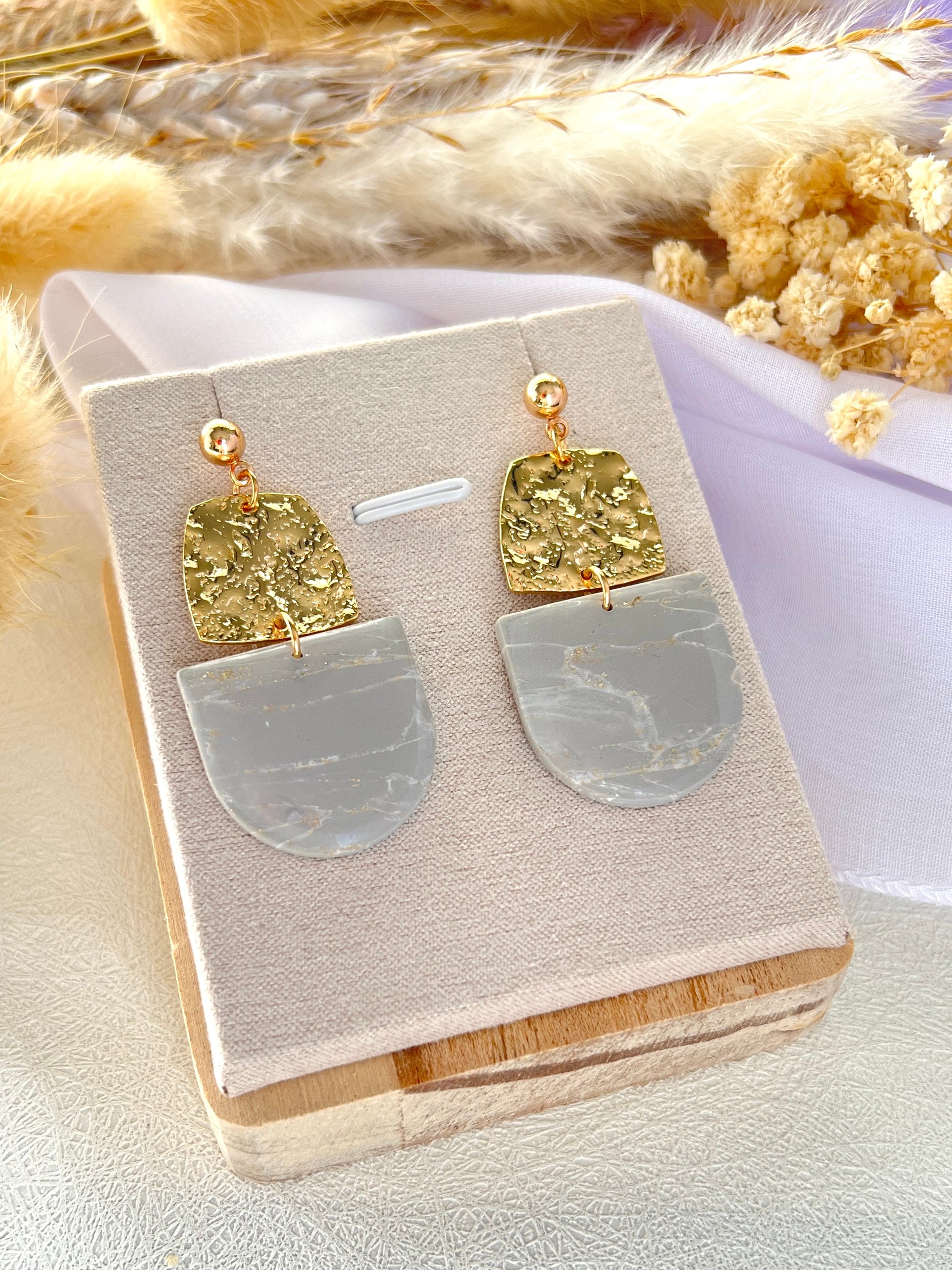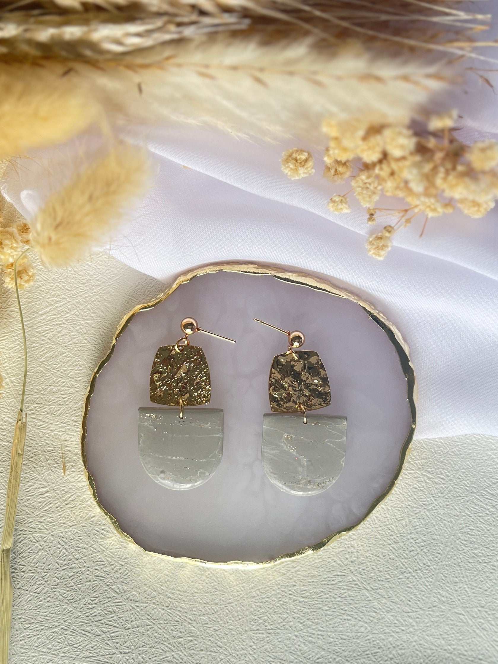 De amee' oorbellen zijn met de hand gemaakt van hoogwaardige polymer klei met een verfijnd groen en goud marmer effect. De geometrische vorm en goudkleurige accenten creëren een moderne, tijdloze uitstraling die moeiteloos past bij je outfit.