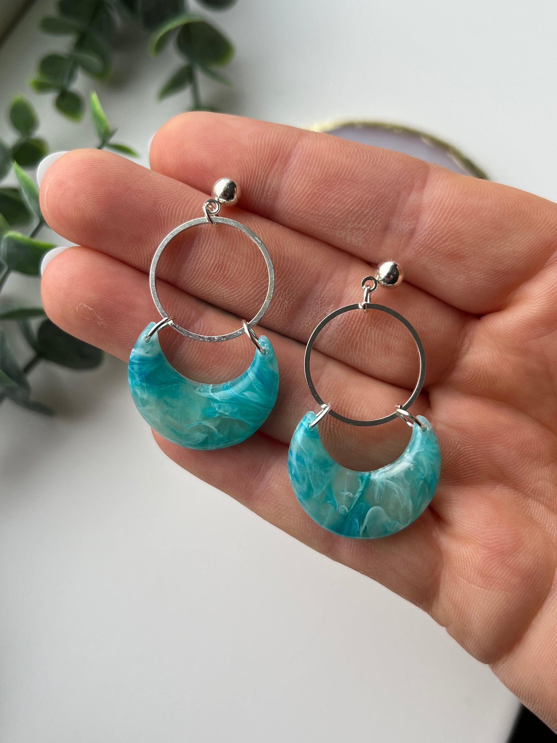 Elk paar wordt met de hand gemaakt uit polymeer klei en heeft een unieke marmerlook in azuurblauw en wit, waardoor het lijkt alsof er een stukje zee in gevangen zit.