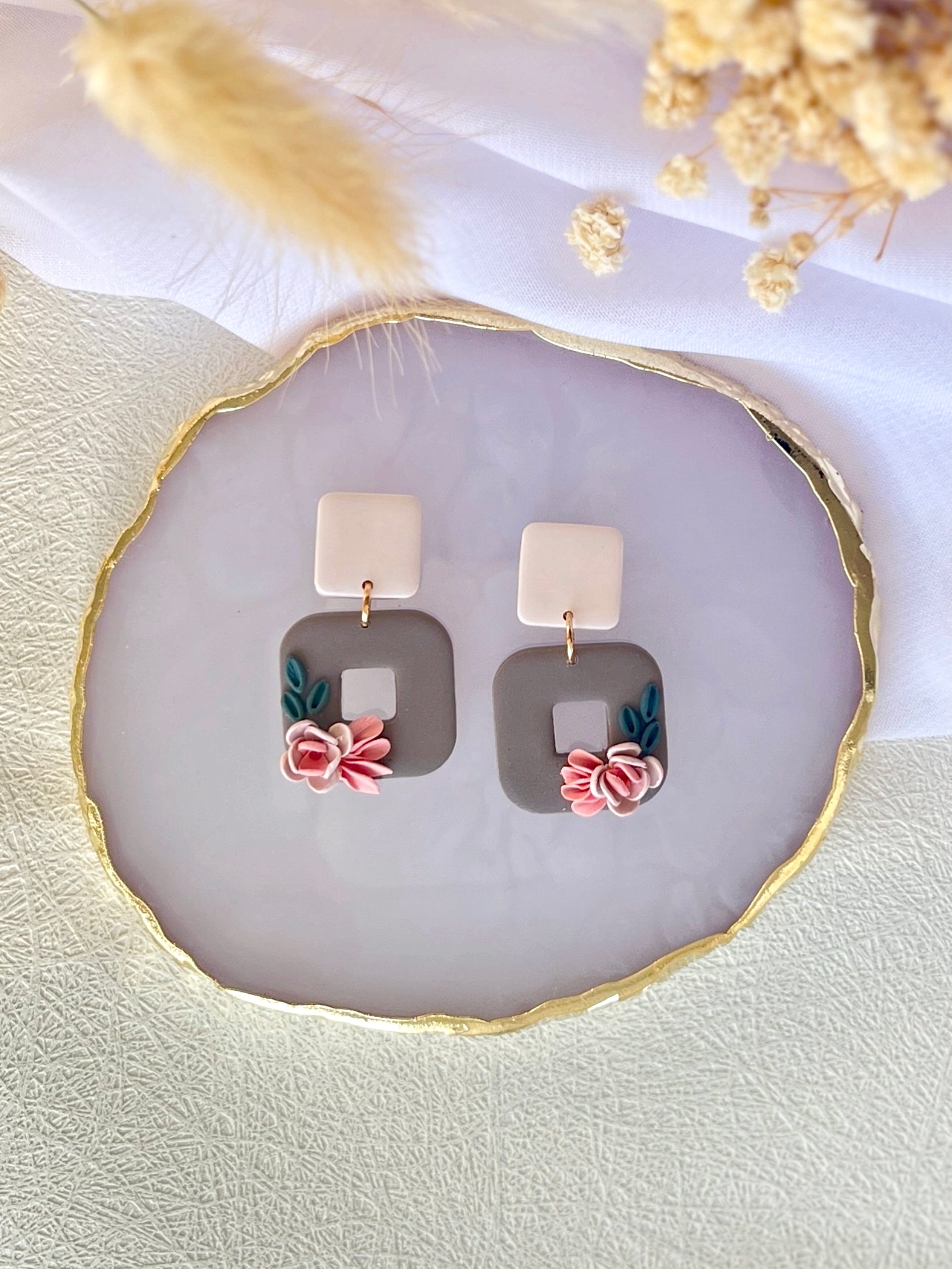 De Mila oorbellen combineren natuurlijke elegantie met modern design. Handgemaakt van hoogwaardige polymeerklei, met vierkante vormen en met zorg gevormde bloemen in zachte pastel- en aardetinten. De kleuren — beige, bruin en roze — geven deze oorbellen een warme, harmonieuze uitstraling die past bij elk seizoen.