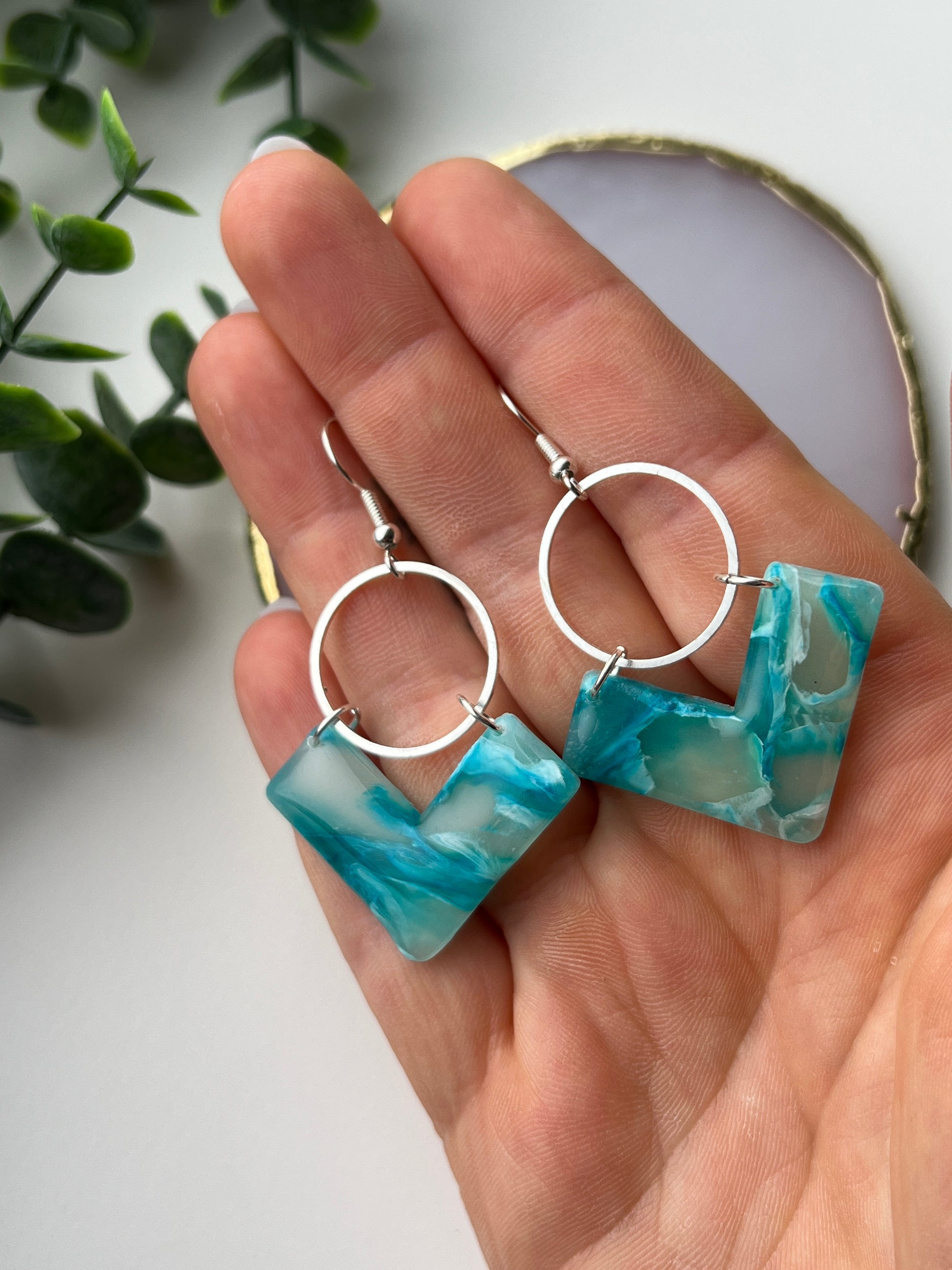 Elk paar wordt met de hand gemaakt uit polymeer klei en heeft een unieke marmerlook in azuurblauw en wit, waardoor het lijkt alsof er een stukje zee in gevangen zit.